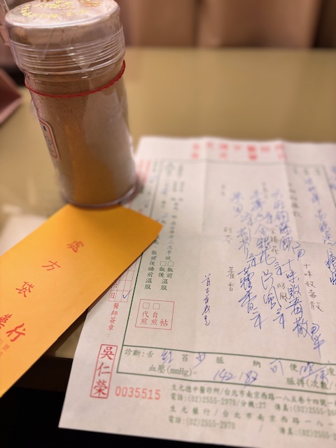 舌診では、”舌の色は紅で良好、舌の苔が少ない”とカルテに書かれました。油化街で真っ赤の桑ジュース飲んだからもあるのでは?体温36.7 血圧高め。142/87 (今までで最高かも 異国で緊張と少し高揚するからね)
