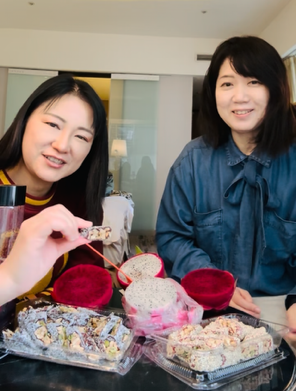 ヌガーのお菓子を買いました。ナッツなどを挟んで筒状に丸めたものをその場で切って詰められてるというフレッシュなものでした。お土産用では、売っていない食材を使っています。下の写真は、ホテルで食べたそのヌガーです。岩附さんの手にあるのがそうです。それぞれ仙草の入ったものと紅麹の入ったヌガーです。(動画から切り取ったものです)それぞれ半分ずつ分け合いました。お菓子のパックも破れやすいものだったので、ジップロックを持参したのが役立ちました。また白と赤のドラゴンフルーツを買ってもらったので、持参の果物ナイフで半分に切り、そのままスプーンで掬って食べました。