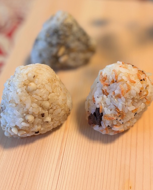 今回のおにぎりの具に使ったのは、桜えび・黒胡麻・白胡麻・ハト麦・赤紫蘇・松の実。ベースには真鯛のほぐし身を使いました。
